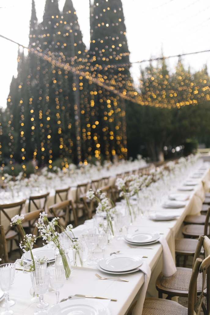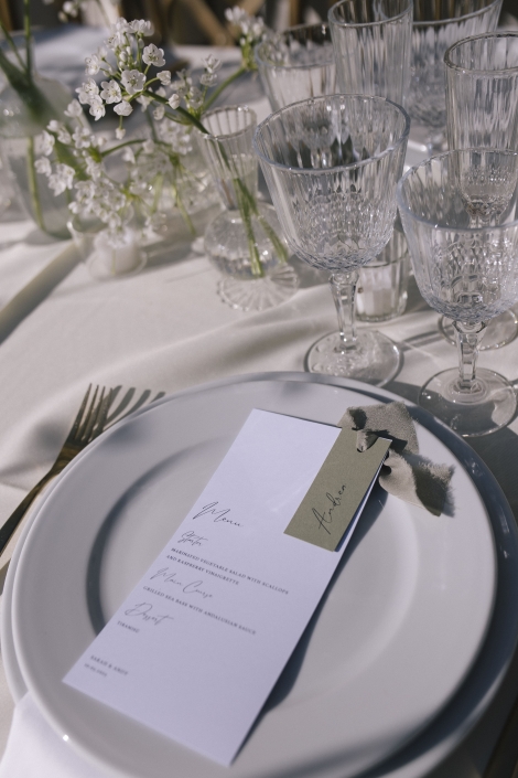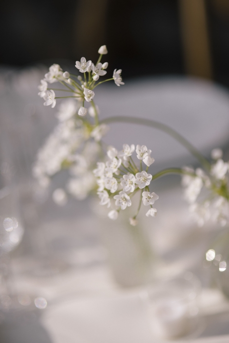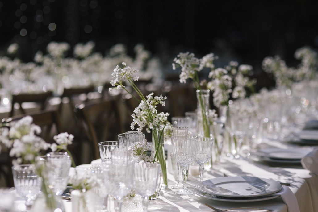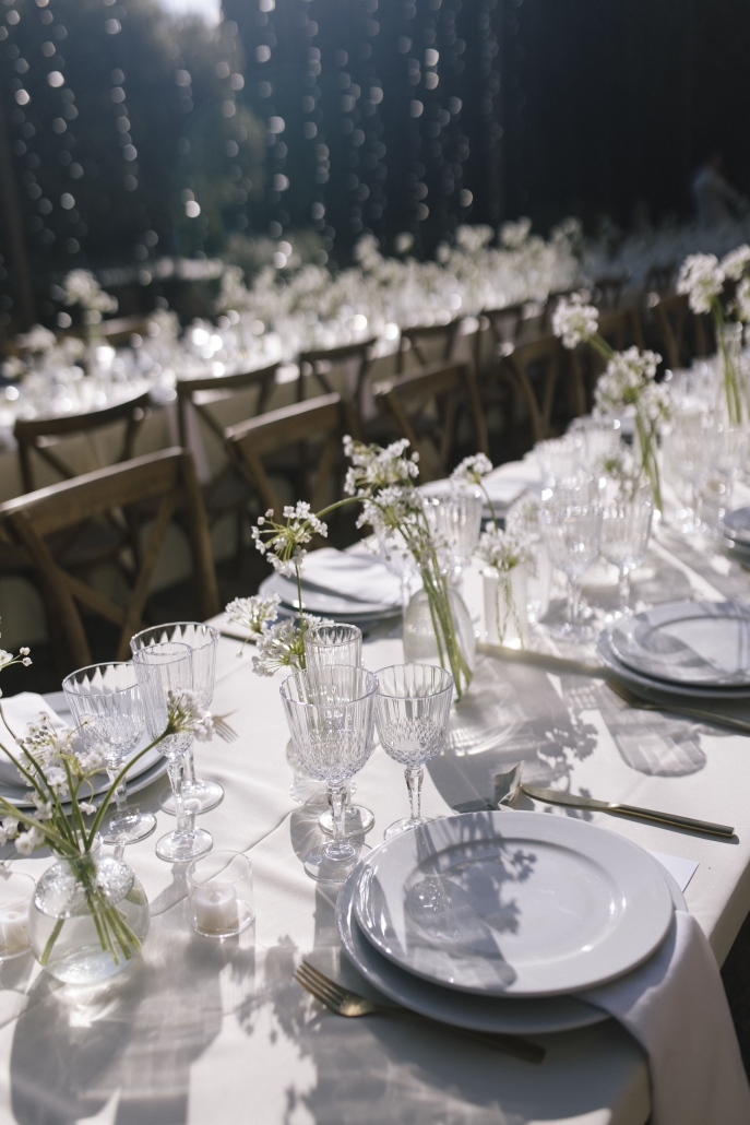 For the decor, we opted for a very clean aesthetic: long tables, white linens, vintage glassware, and small floral arrangements in shades of green and white. Light elements, designed to complement the space without stealing the spotlight.